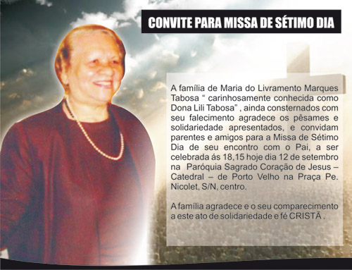 GeralMissa de 7º dia - D. Lili Tabosa Segunda-feira, 12 Setembro de 2011 - 13:53 | RONDONIAGORA SIGA-NOS NO Veja Também Policial rodoviário federal que começou carreira em Rondônia morre em Sergipe após mal súbito em teste físico Formatura de quase 400 colaboradores marca nova fase das operações da Nova 364 Negociação de contas de luz entra no clima da Black Friday com até 80% de desconto Condenado a 40 anos de prisão o homem que matou a ex-companheira minutos após ela receber medida protetiva