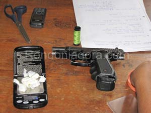 Através de mandado de busca e apreensão, policiais do Departamento de Narcóticos (Denarc) prenderam nesta terça-feira, Ramisson Santos Soares, 24 anos, suspeito de envolvimento com o tráfico de droga. Na operação, os agentes apreenderam várias pedras de cocaína oxidada, nove papelotes de merla, uma porção de cocaína em pó, uma pistola 380, plásticos e outros objetos, que estariam em poder de Soares, o qual já cumpriu pena por assalto. Conforme foi informado, o suspeito era investigado havia vários dias.