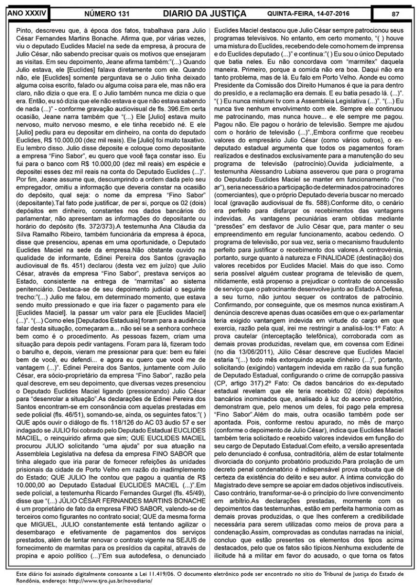 Cinco anos depois de uma das maiores atuações de combate a corrupção nos poderes constituídos de Rondônia, a Operação Termópilas, o ex-deputado Euclides Maciel foi condenado a 4 anos de reclusão pela Justiça de Rondônia por extorquir dinheiro do empresário Júlio Bonache em troca de defesa na tribuna da Assembleia Legislativa.